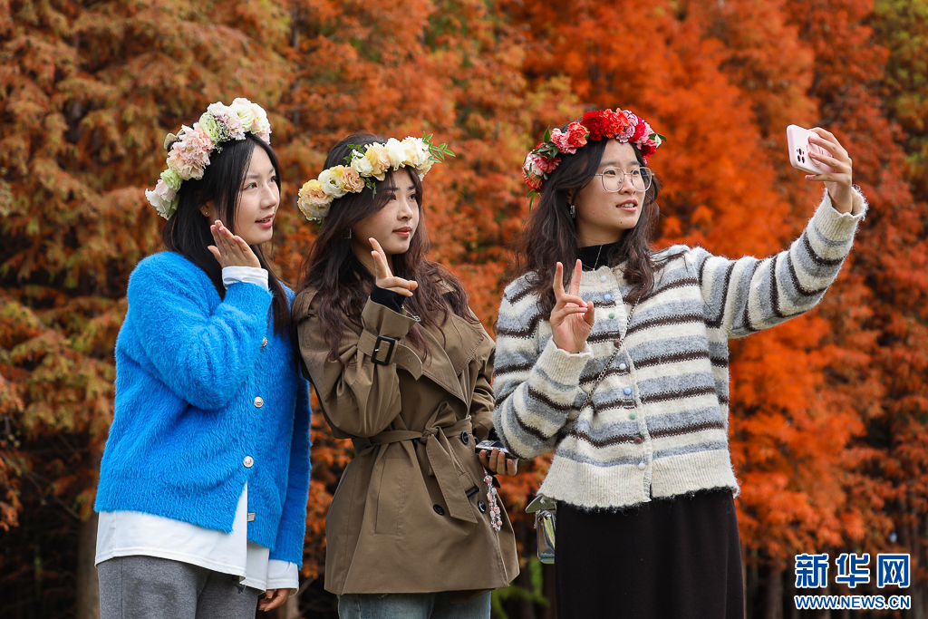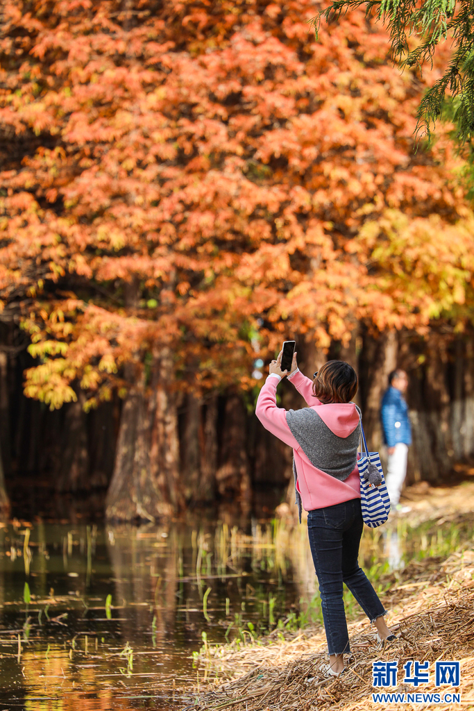 游客在湿地公园内拍照打卡(11月15日摄)。新华网发(郑益 摄)