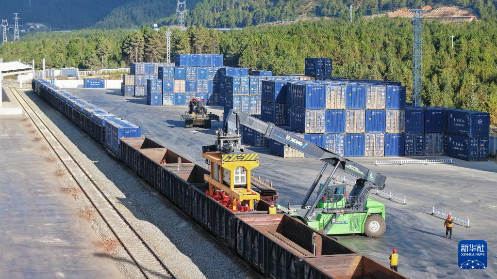 11月21日,工人在云南迪庆藏族自治州小中甸货场进行装卸作业(无人机照片)。新华社发(杨紫轩摄)