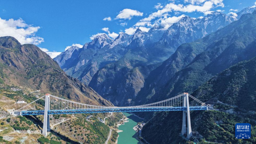 这是11月21日拍摄的虎跳峡金沙江铁路大桥。大桥全长882.5米,起于玉龙雪山隧道出口,止于哈巴雪山隧道进口,是丽香铁路的重点控制性工程(无人机照片)。新华社发(杨紫轩摄)