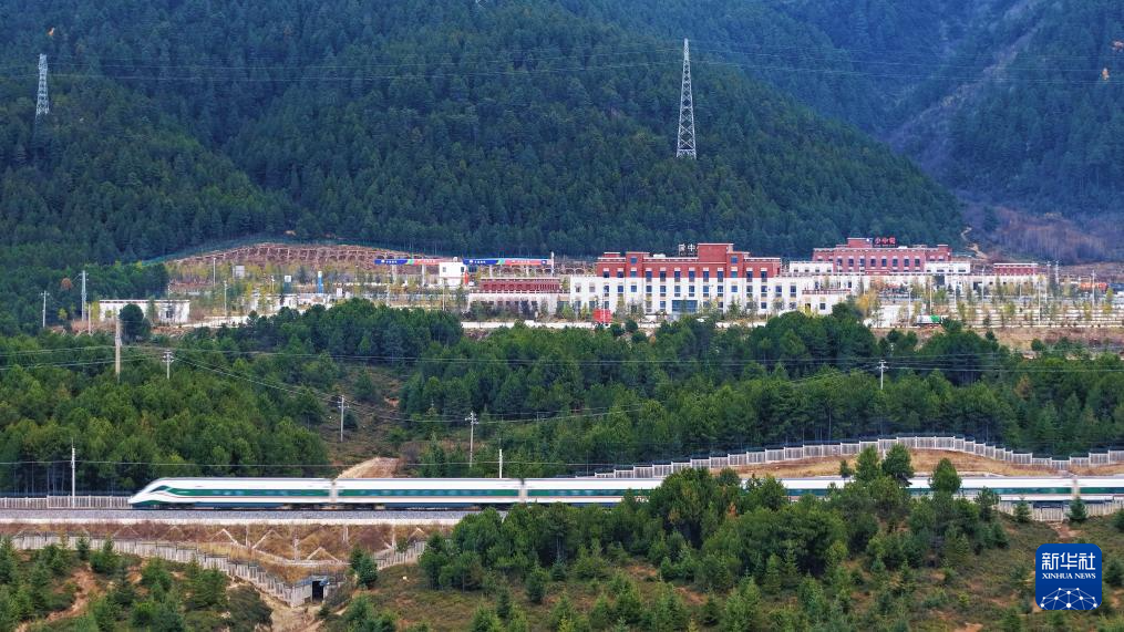 11月21日,一列动车组列车驶过云南迪庆藏族自治州小中甸站(无人机照片)。新华社发(杨紫轩摄)