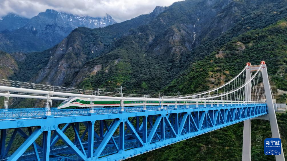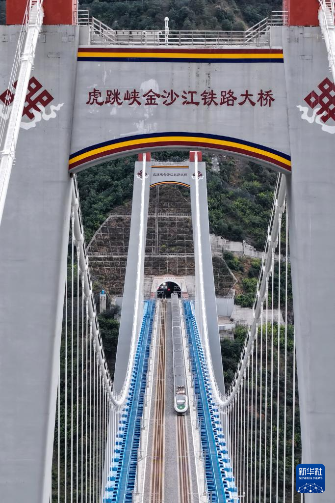 11月21日,一列动车组列车经过虎跳峡金沙江铁路大桥(无人机照片)。新华社发(杨紫轩摄)