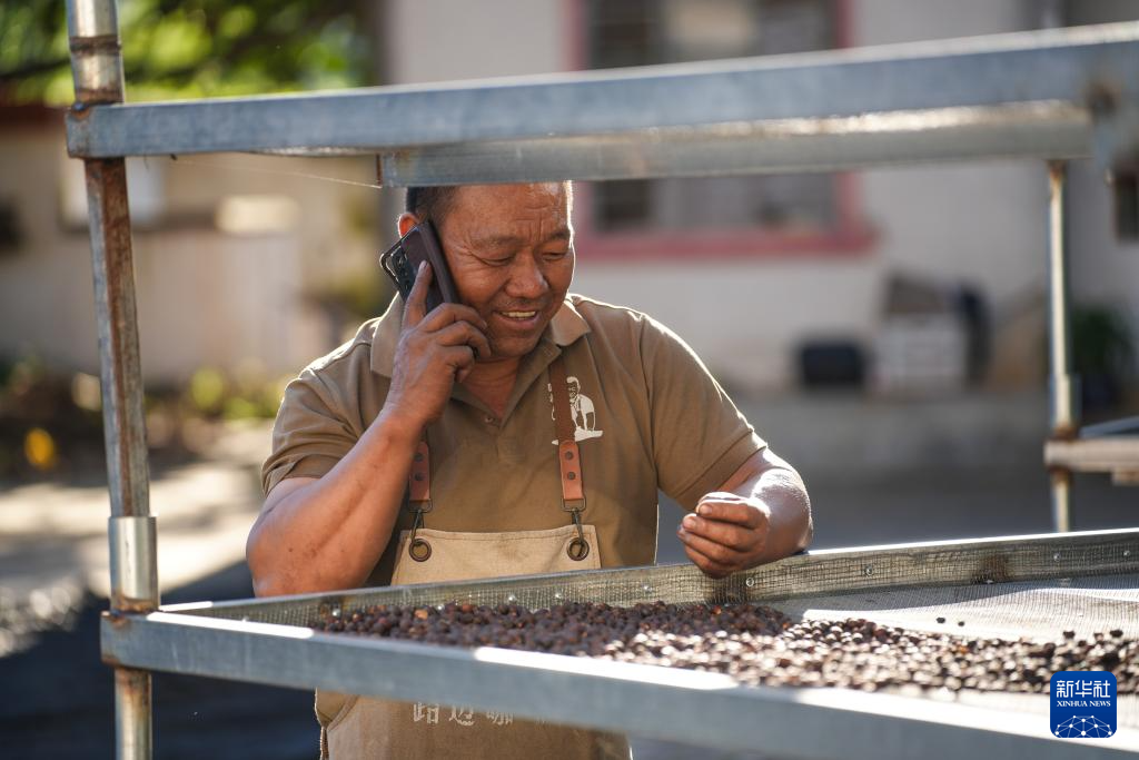 11月15日,李金合在保山市隆阳区芒宽乡烫习村晾晒咖啡豆。新华社记者 高咏薇 摄