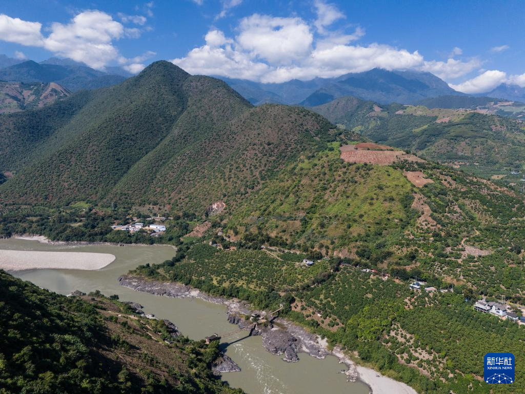 这是11月15日拍摄的保山市隆阳区芒宽乡横跨怒江的双虹桥,李金合经营的路边咖啡馆在双虹桥边(无人机照片)。新华社记者 高咏薇 摄