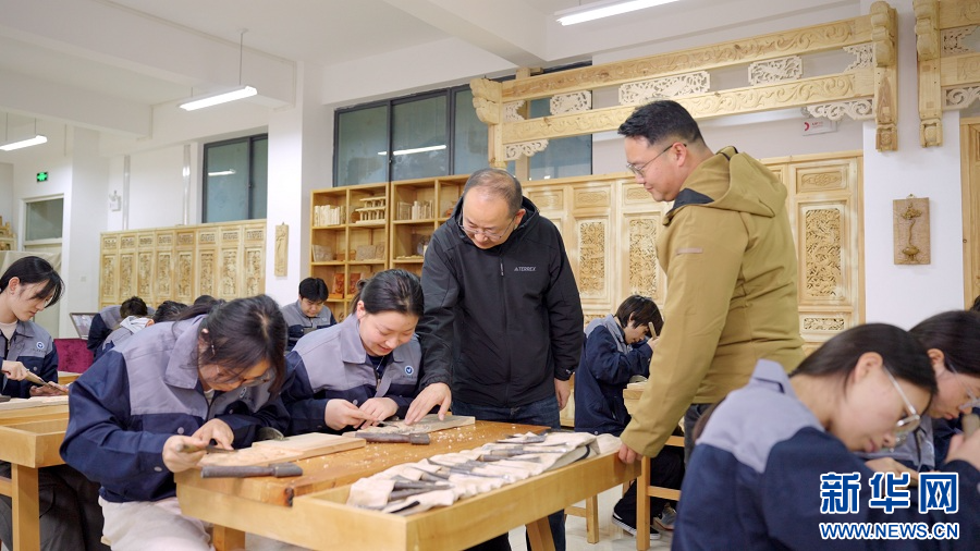 段宜宏(左)了解学生雕刻技艺情况(11月6日摄)。