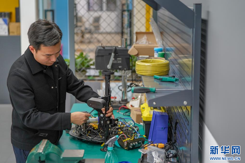 郑棋元在云南技师学院实验室组装移动机器人。新华社记者 彭奕凯 摄
