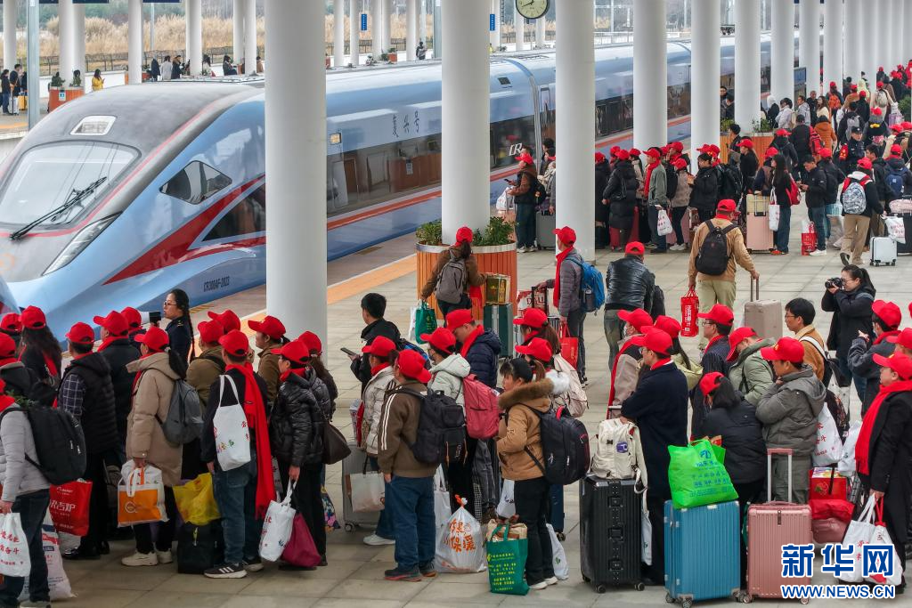 务工专列乘客在云南省广南县站登车(无人机照片)。新华社记者 彭奕凯 摄