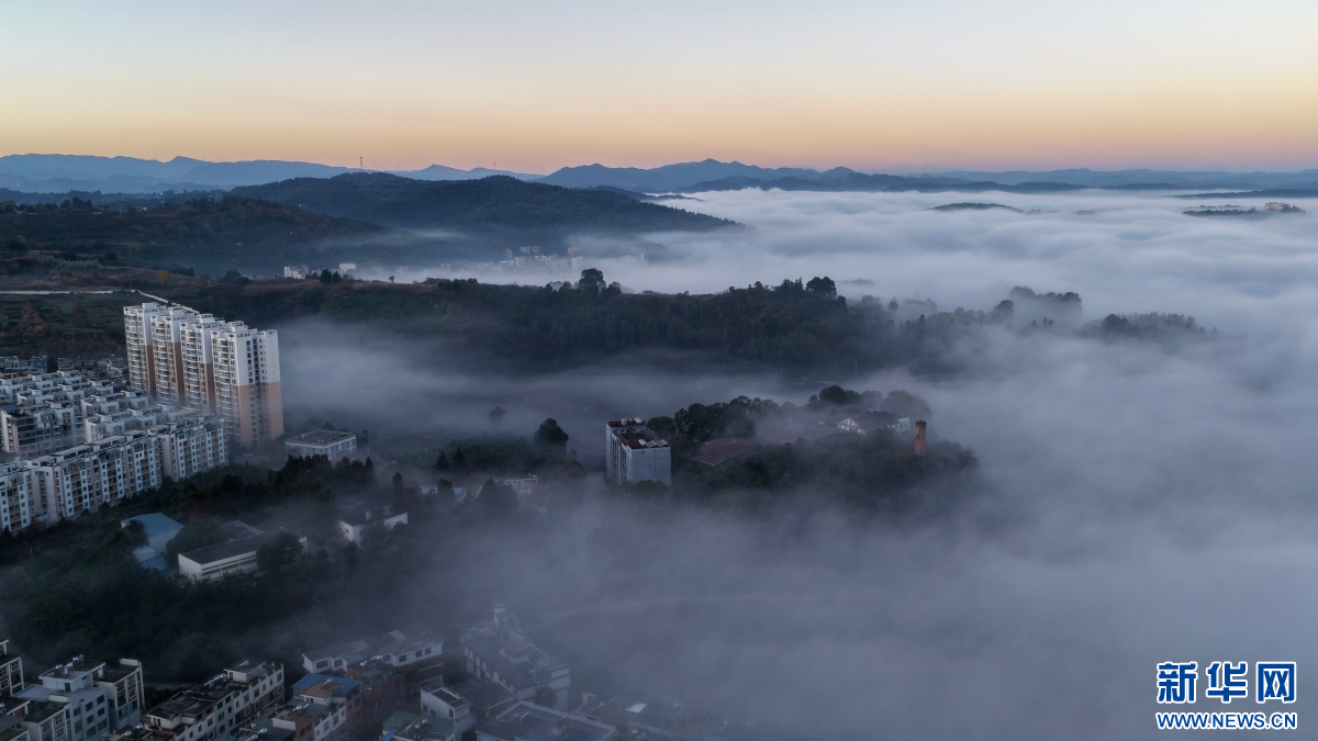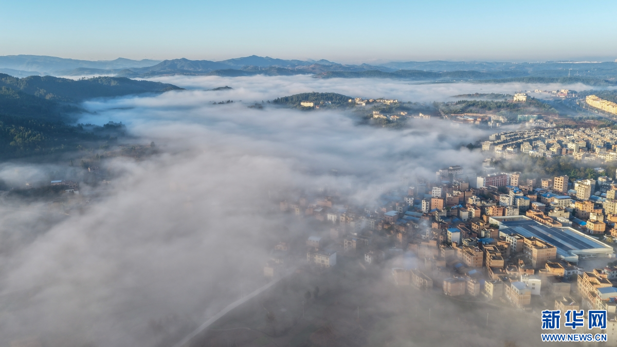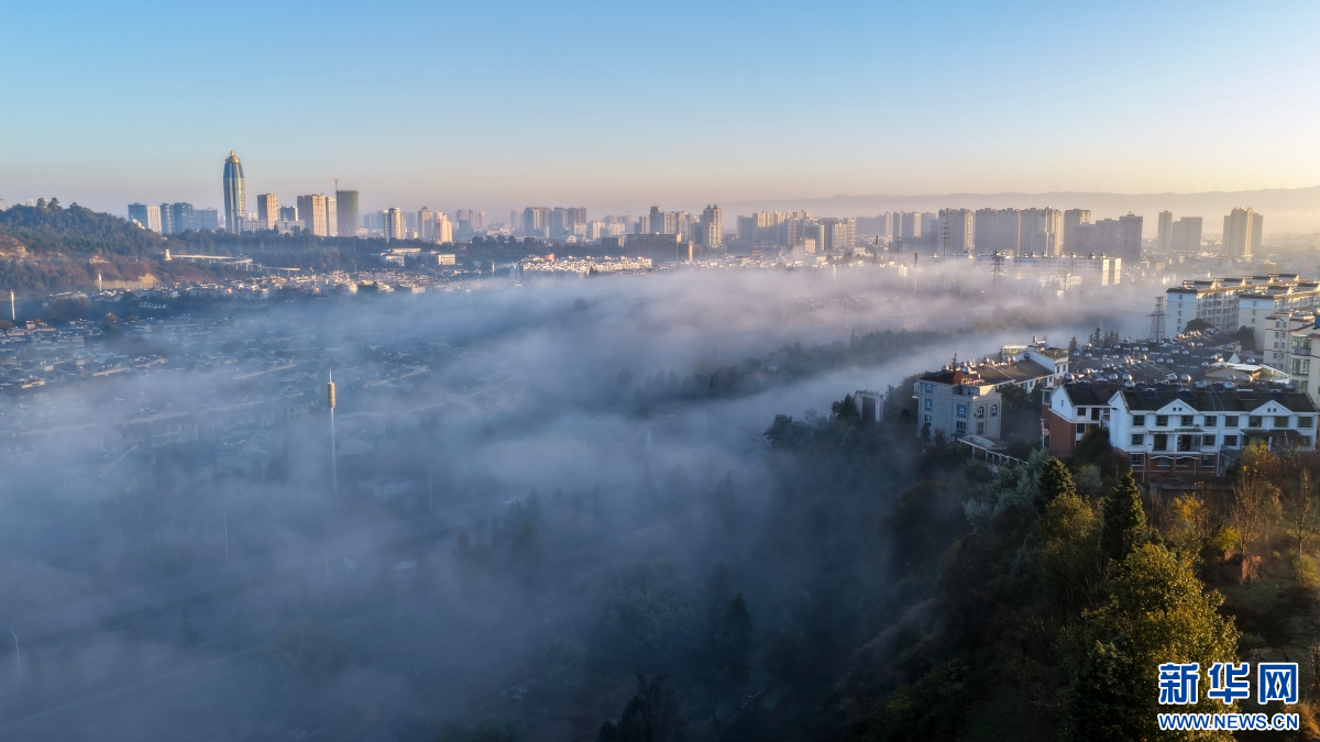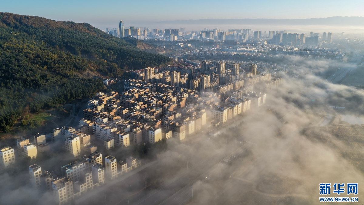 在云南省曲靖市麒麟区潇湘街道拍摄到的晨景,雾漫城乡,云绕山峦(12月6日摄)。新华网发(孙文来 摄)