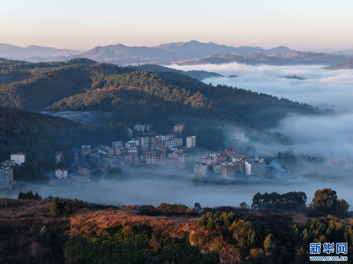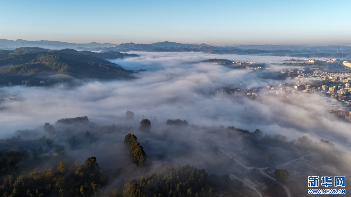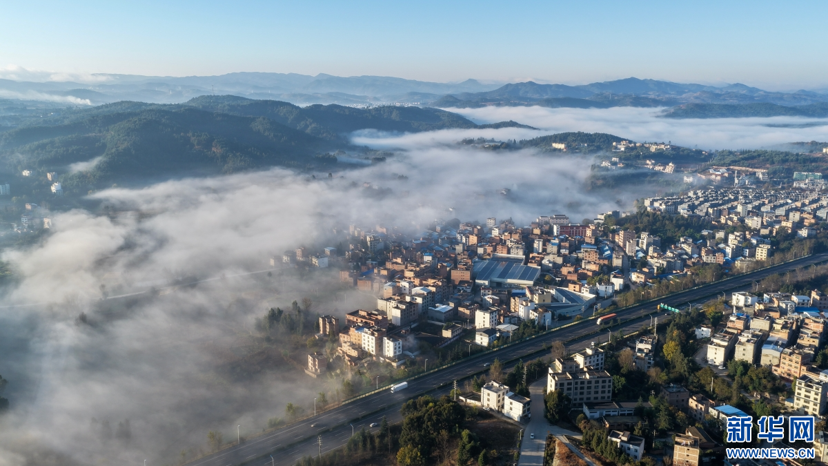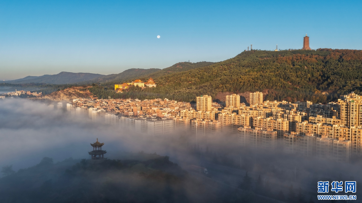 在云南省曲靖市麒麟区潇湘街道拍摄到的晨景,雾漫城乡,云绕山峦(12月6日摄)。新华网发(孙文来 摄)