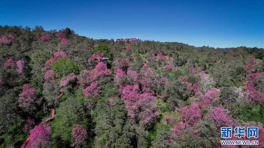 近日,在云南省德宏傣族景颇族自治州陇川县邦瓦山古树樱花谷,一朵朵樱花正迎着暖阳悄然绽放。从远处望去,整座山谷都被粉色的樱花围绕,云雾缭绕时,樱花林若隐若现,宛如仙境。(完)(段宗智 王景 方雯青 孔扎选晶)