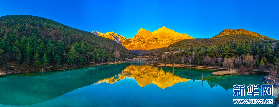 近日,摄影师在云南省丽江市蓝月谷,拍摄到了玉龙雪山“日照金山”美景。蔚蓝的湖水与金色的雪山同框,冷暖色调在大自然笔下完美交融。(完)(徐俊 韩学海)