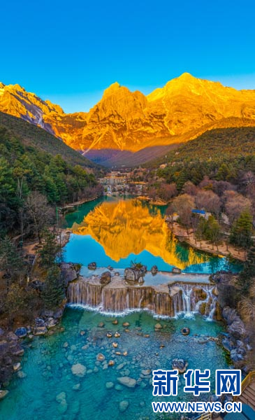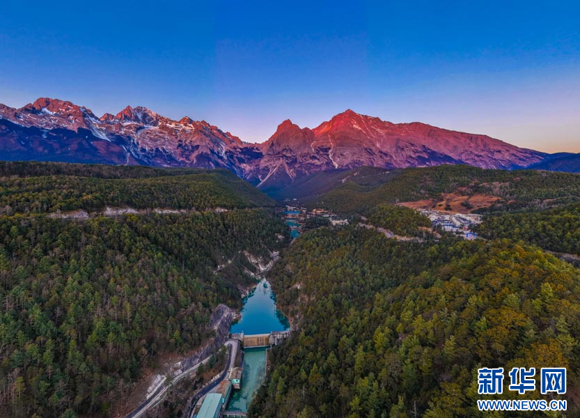 蓝月谷玉龙雪山日照金山(1月13日摄)。新华网发(徐俊 摄)
