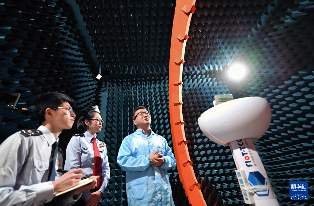 4月25日,在福州物联网开放实验室有限公司OTA天线测试实验室,福州经济技术开发区税务局工作人员在听取企业负责人的介绍。作为物联网公共服务平台,该企业2022年共计享受研发费用加计扣除160万元。新华社记者 魏培全 摄
