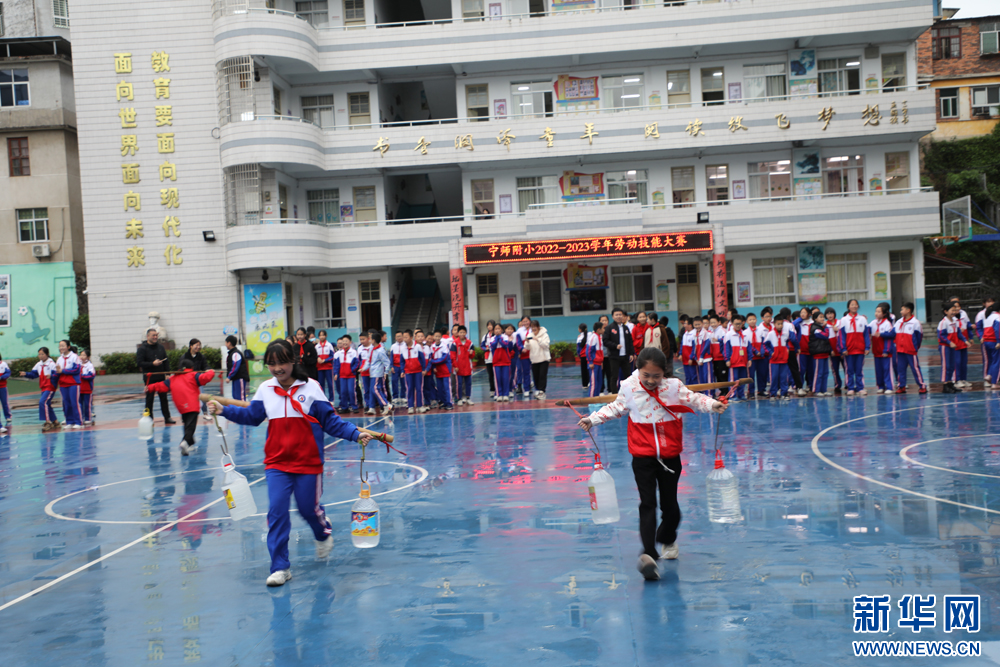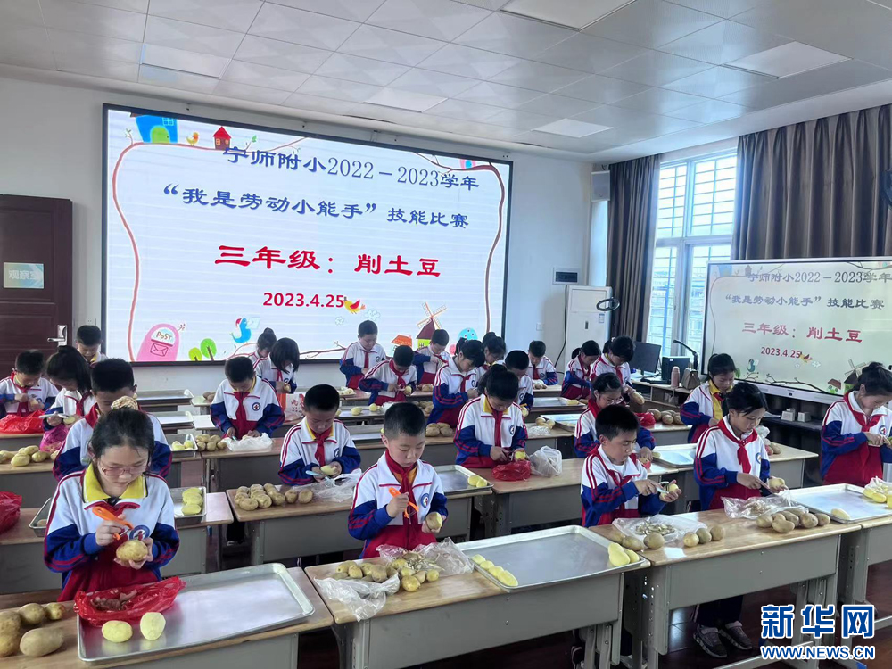 缝扣子、削土豆、叠衣服、挑水……4月25日,福建省宁化师范附属小学开展“我是劳动小能手”劳动技能比赛,300多名学生按年级分项目开展比拼,争当劳动小能手,迎接“五一”劳动节。(刘丰 赖全平 张伟华)