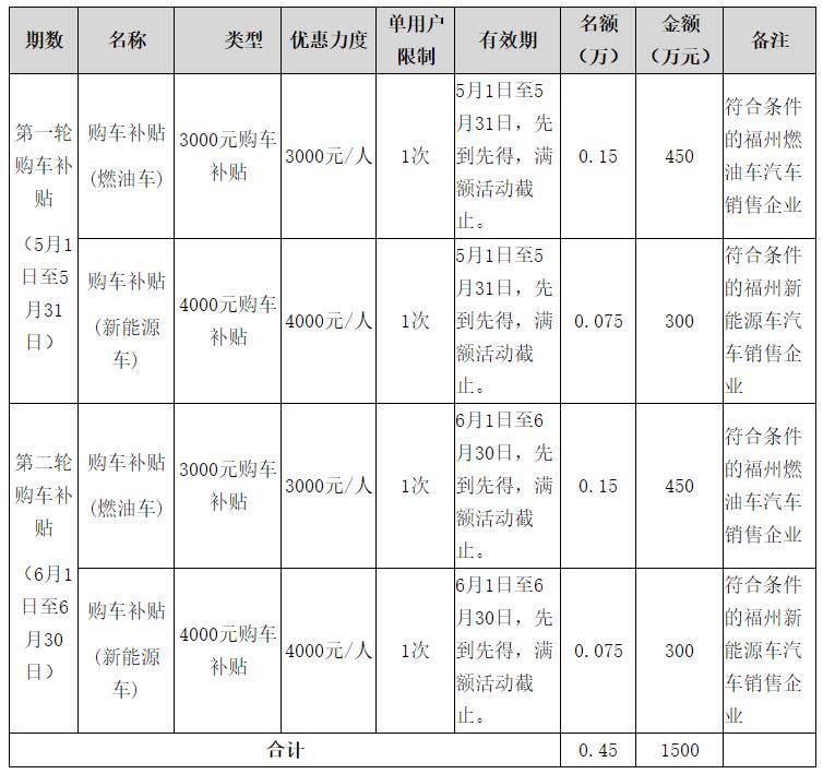 根据方案,本次活动拟发放数字人民币购车补贴1500万元,共4500份,分5月和6月两轮开展。每一轮燃油车购车补贴分别为450万元、1500份,新能源车购车补贴分别为300万元、750份;燃油车购车补贴3000元/人、新能源车购车补贴4000元/人。