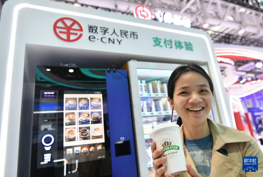 4月26日,在第六届数字中国建设成果展览会现场,一名观众展示用数字人民币购买的咖啡。新华社记者 魏培全 摄