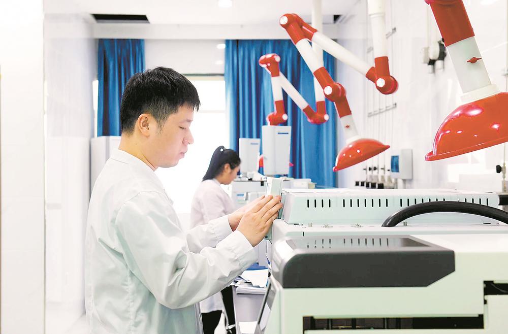 4日,在尤溪县经济开发区城西园,福建奥翔体育塑胶科技股份有限公司科研人员正在操作设备,对体育塑胶颗粒新产品进行测试。