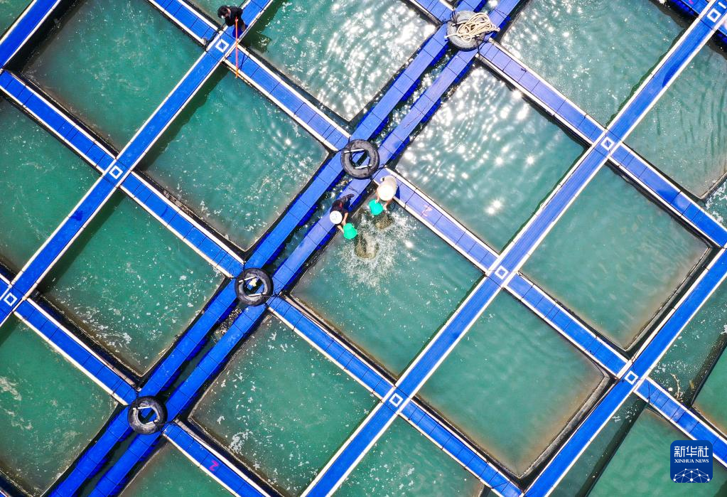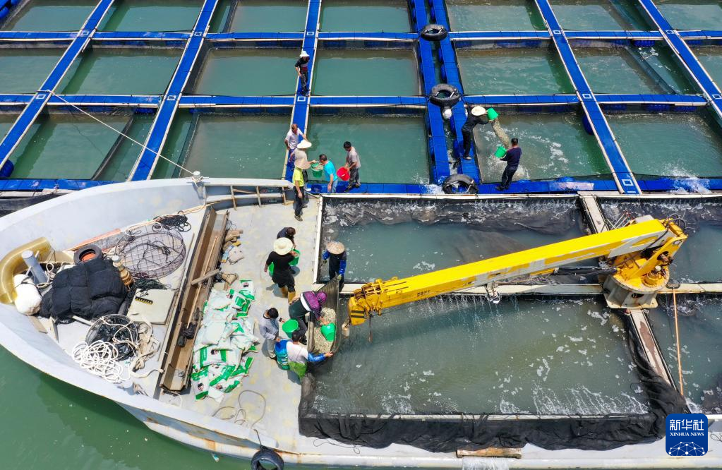 5月9日,在福建宁德三都澳东冲口海域新型养殖渔排上,养殖户投放大黄鱼鱼苗(无人机照片)。新华社发(王志凌 摄)