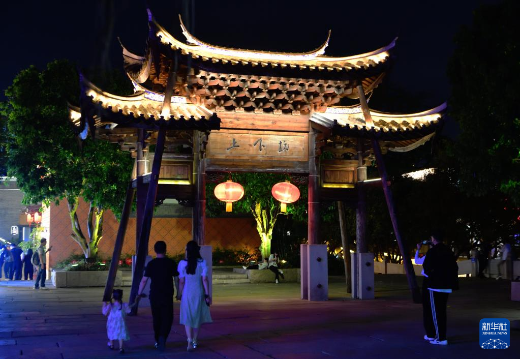 在福州三坊七巷历史文化街区入口,游客经过“有福之州 博物馆之夜”的宣传展示牌(5月16日摄)。新华社记者 魏培全 摄