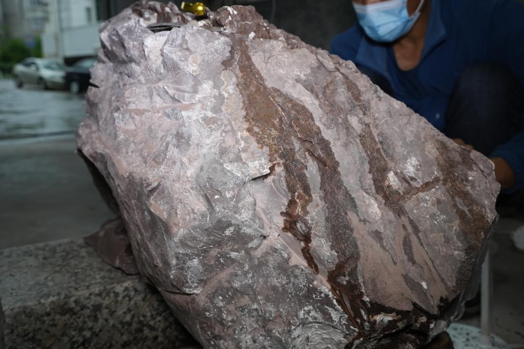 图为工作人员正在研究恐龙蛋化石。(受访者供图)