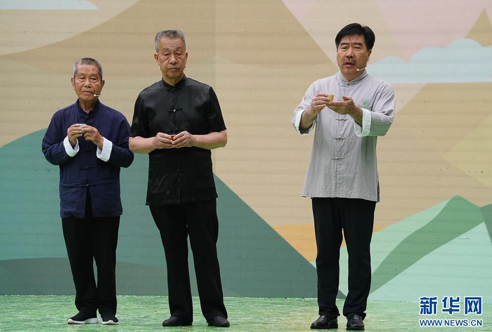 5月21日举行的开幕式上,福鼎白茶制作技艺非遗传承人梅相靖、武夷岩茶(大红袍)制作技艺非遗传承人王顺明、福州茉莉花茶窨制工艺非遗传承人傅天龙走上舞台,为嘉宾奉茶。新华网 肖和勇 摄