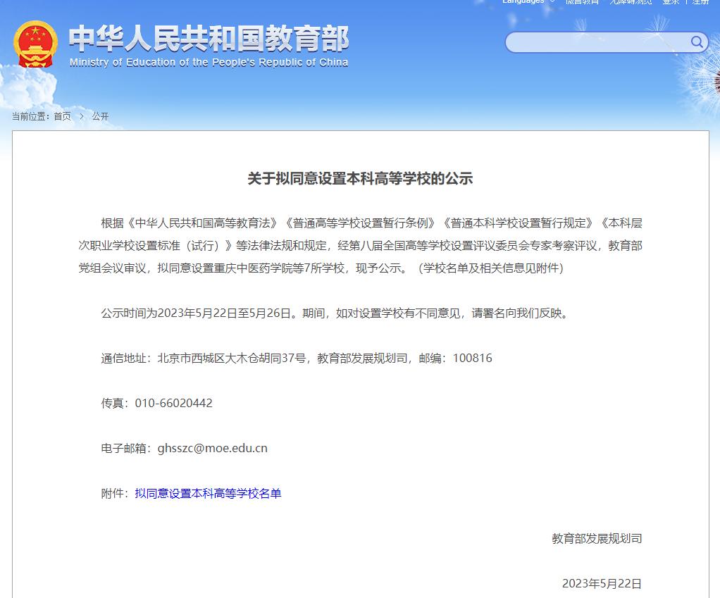 根据《中华人民共和国高等教育法》《普通高等学校设置暂行条例》《普通本科学校设置暂行规定》《本科层次职业学校设置标准(试行)》等法律法规和规定,经第八届全国高等学校设置评议委员会专家考察评议,教育部党组会议审议,拟同意设置重庆中医药学院等7所学校,现予公示。(学校名单及相关信息见附件)