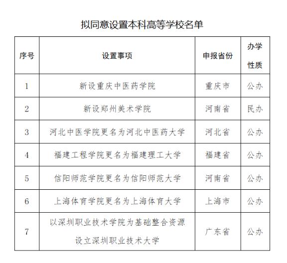 5月22日,教育部发布公示:拟同意设置重庆中医药学院等7所学校。其中包括福建工程学院,更名为福建理工大学。
