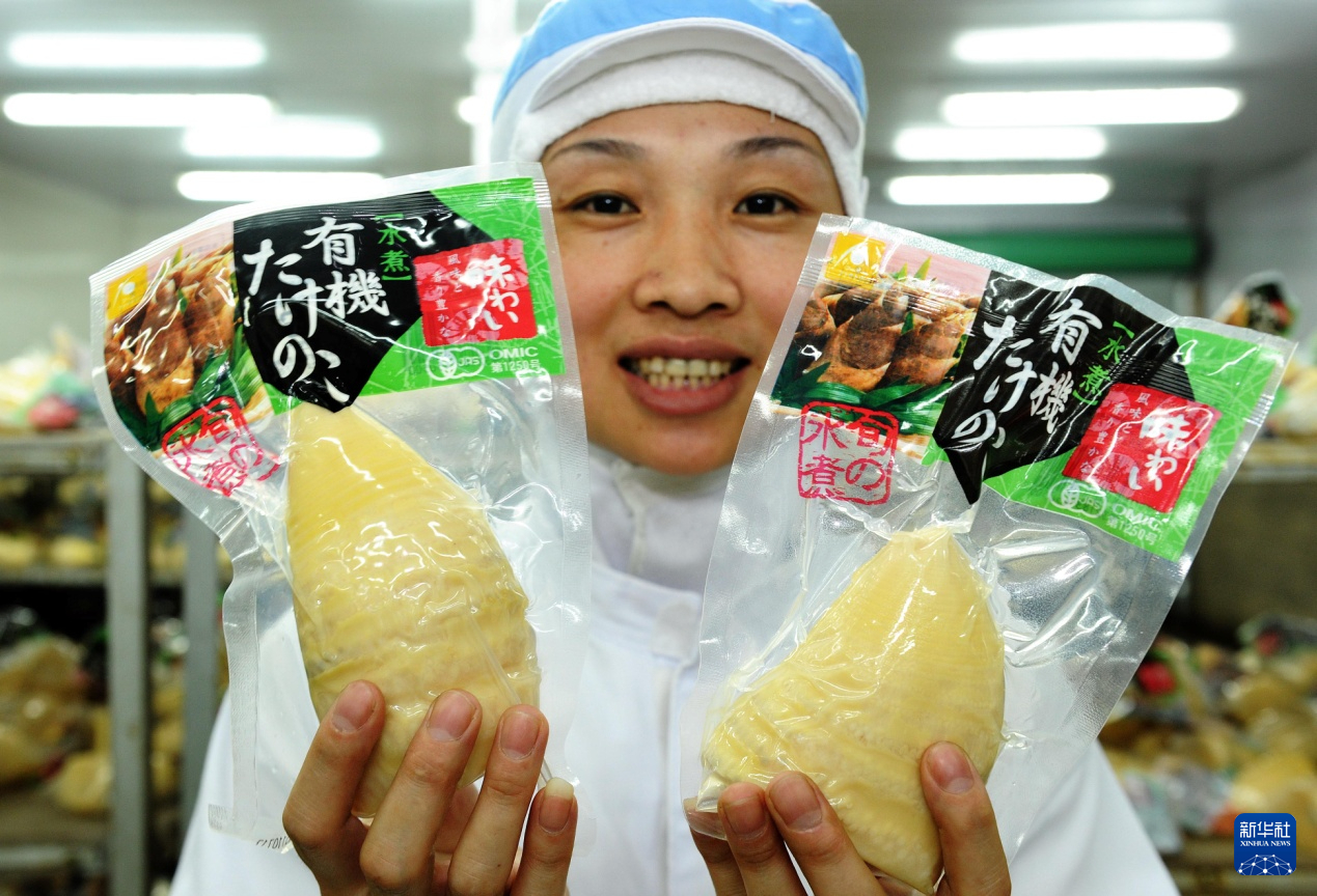 建瓯市一家竹笋加工企业职工在展示出口日本的真空包装保鲜笋产品(资料图)。新华社记者 张国俊 摄