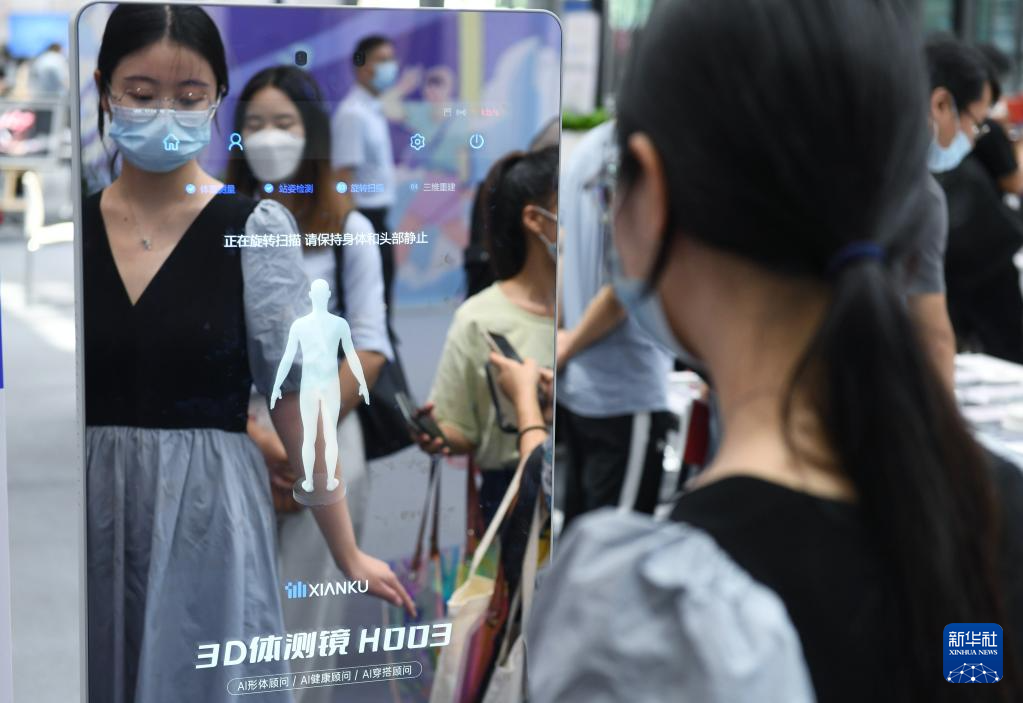 2022年8月17日,观众在第十届中国电子信息博览会上体验3D体测镜。新华社记者 毛思倩 摄