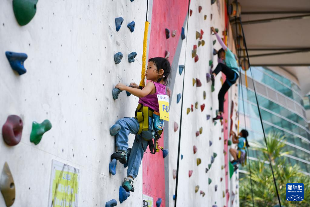 5月20日,3岁半的罗翊宁(左一)在广东省深圳市福田体育公园攀岩。新华社记者 梁旭 摄