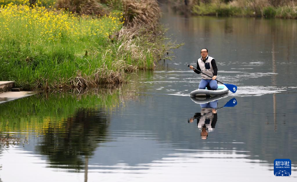 2023年3月29日,爱好者在民宿前的小河中划桨板。新华社记者张晨 摄