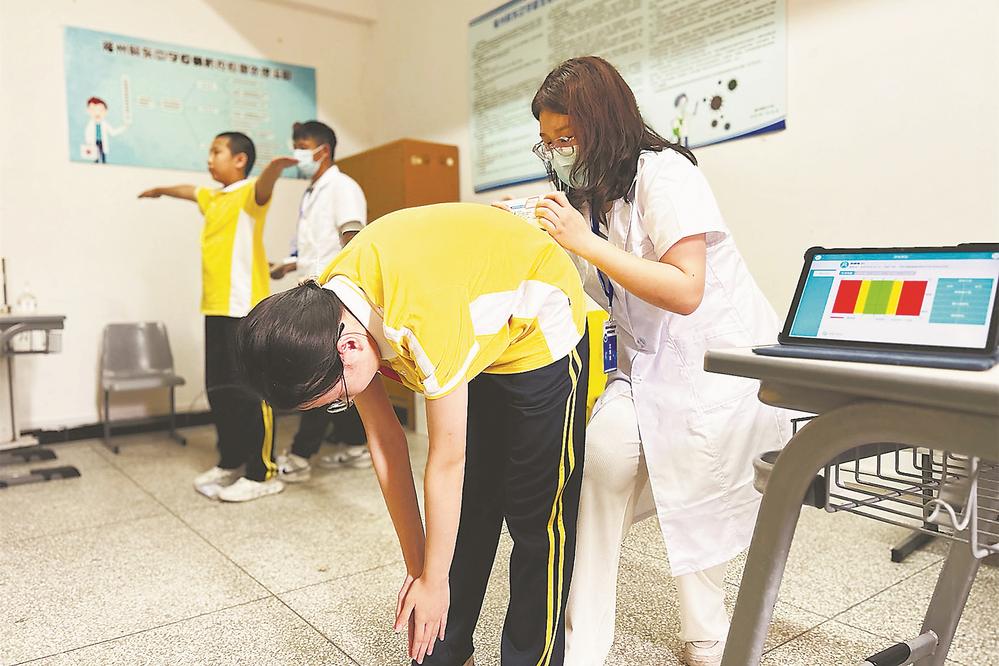 24日下午,在监测点福州屏东中学,七年级的同学在做脊柱侧弯检测。