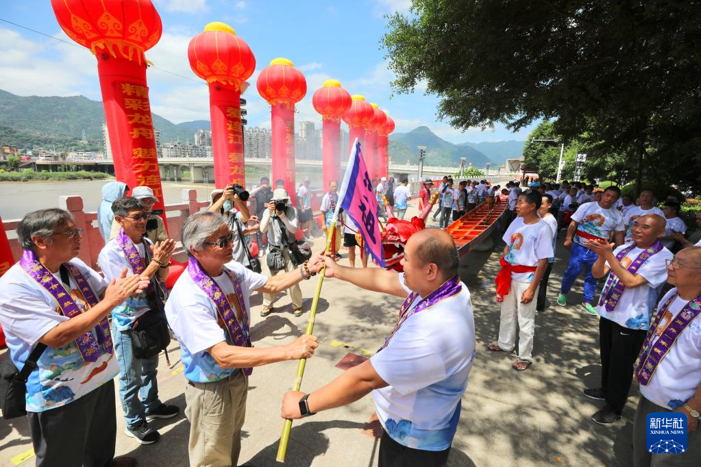 5月31日,福州市连江县两岸龙舟文化交流协会会长林筱江(前右)向马祖乡亲代表曾林官赠送新龙舟。新华社记者 姜克红 摄