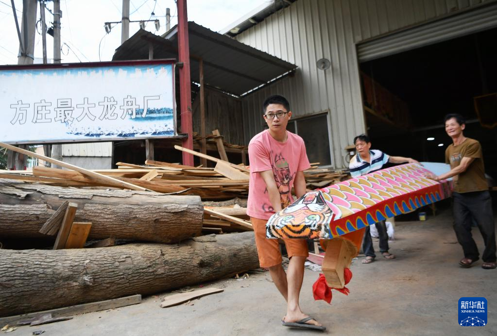 5月31日,在福州市闽侯县南通镇方庄村方忠雄龙舟厂,员工将新龙舟运出。新华社记者 魏培全 摄