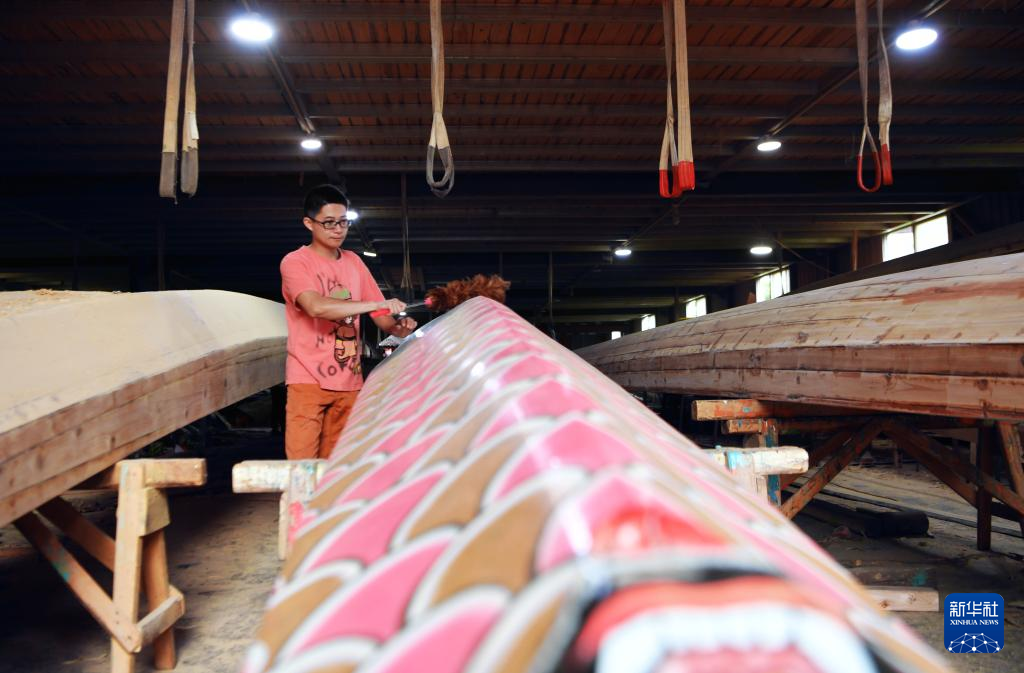 5月31日,福州市闽侯县南通镇方庄村方忠雄龙舟厂的方剑伟擦拭新龙舟。新华社记者 魏培全 摄