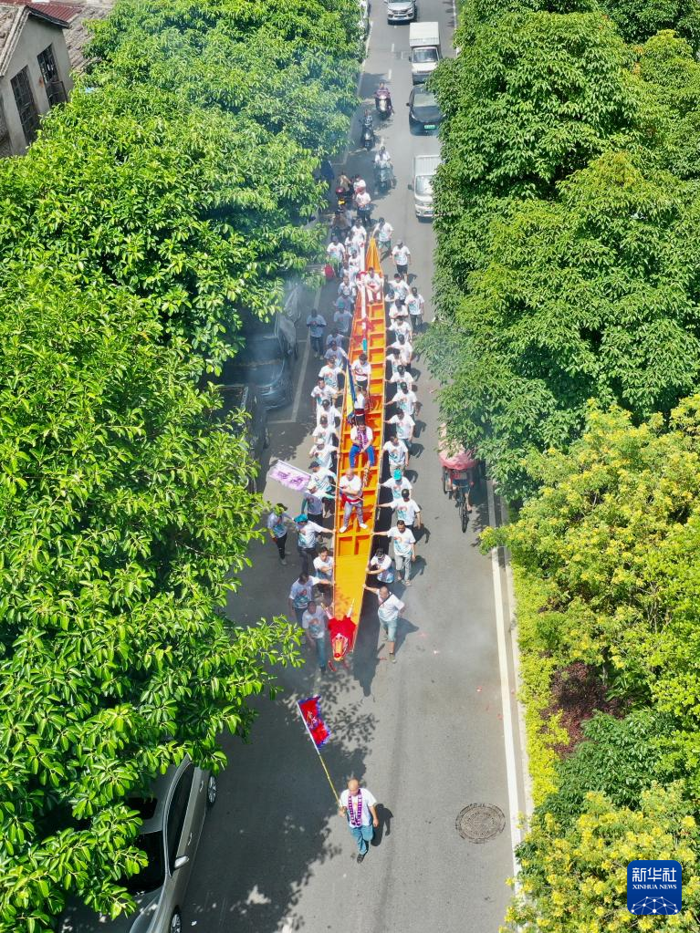 5月31日,福州市连江县龙舟爱好者在运送新龙舟(无人机照片)。新华社记者 姜克红 摄