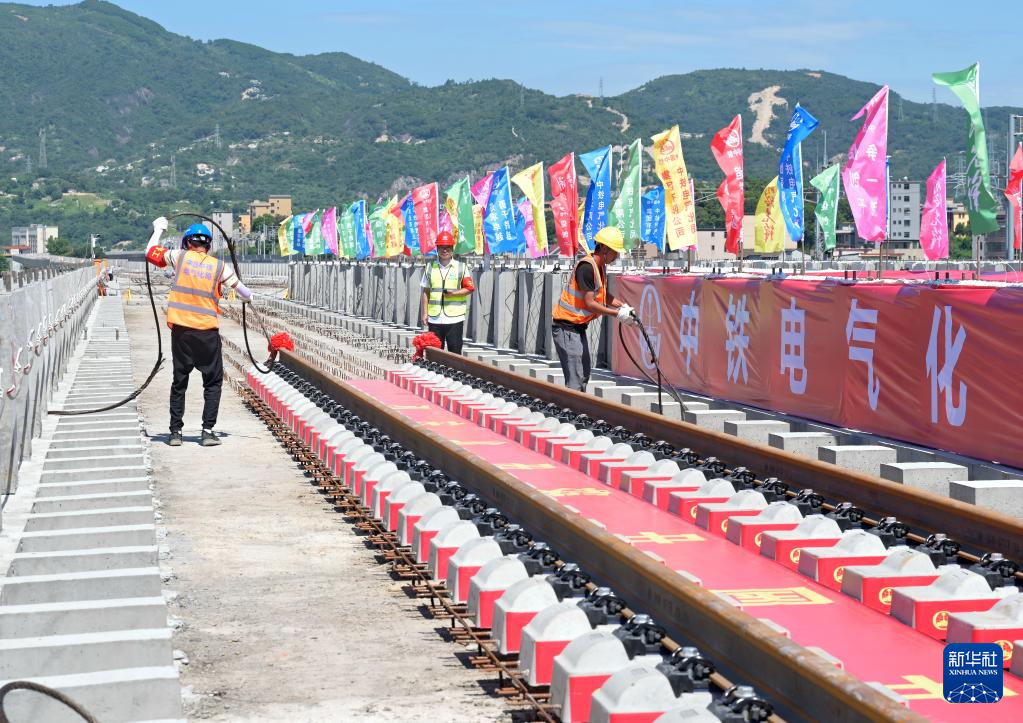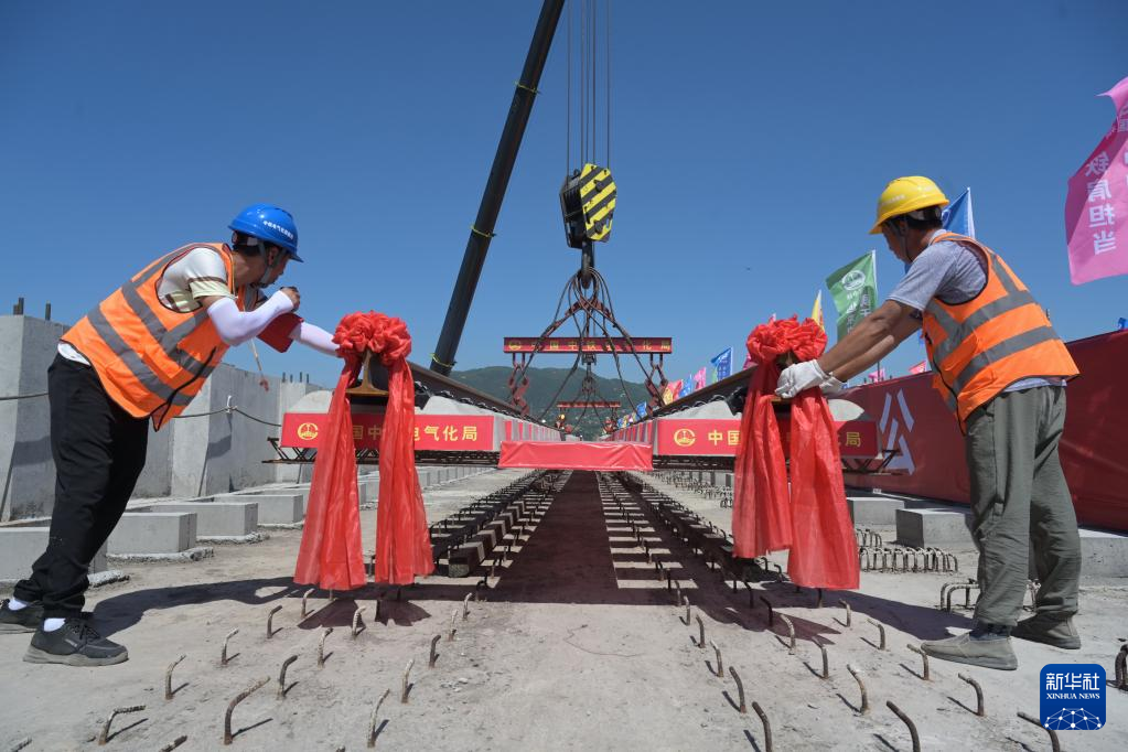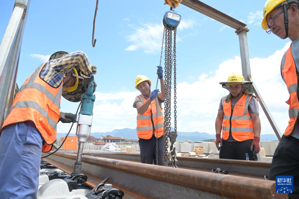 6月1日,中国中铁电气化局施工人员在福州滨海快线首占西高架铺设轨排。新华社记者 林善传 摄