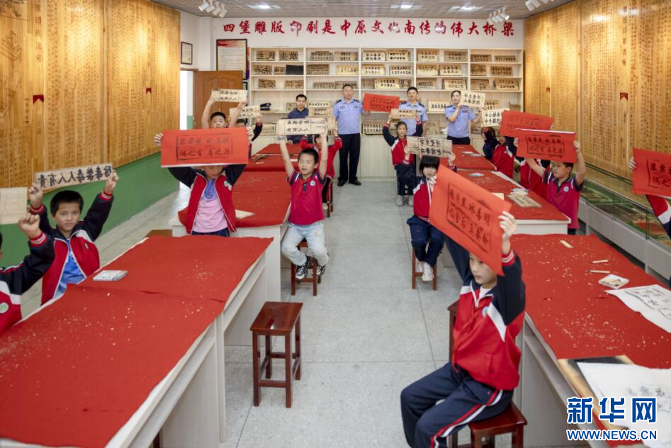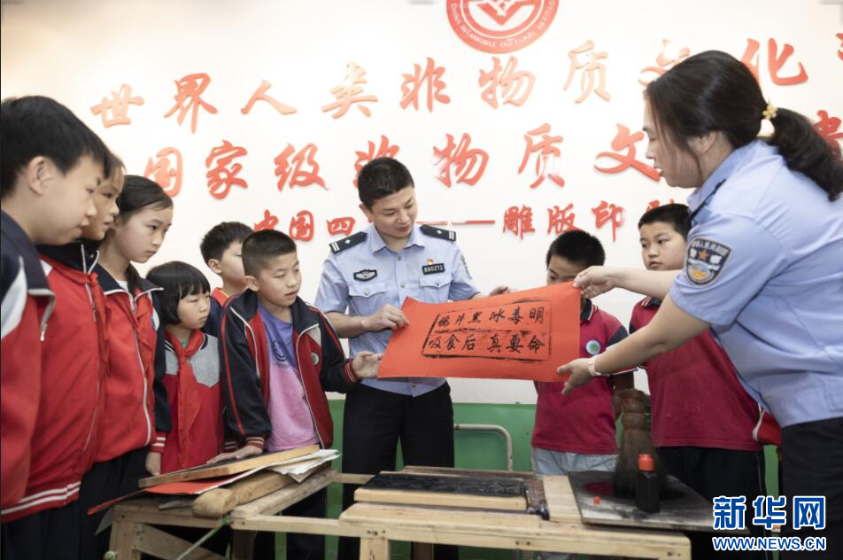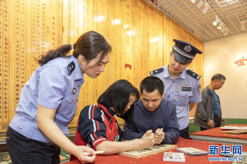 雕版印刷传承人在给民警和学生教学雕刻。新华网发(谢立东 摄)