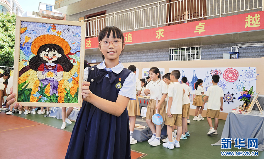 5月31日,厦门市集美区高浦小学四年1班张钰涵展示她与同学共同创作的盘纸作品。新华网 刘默涵 摄