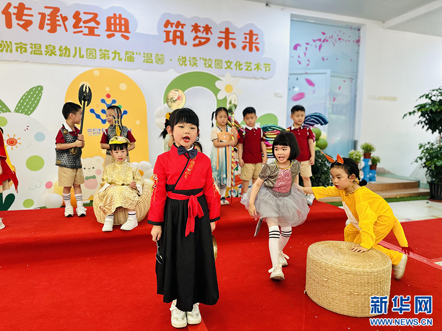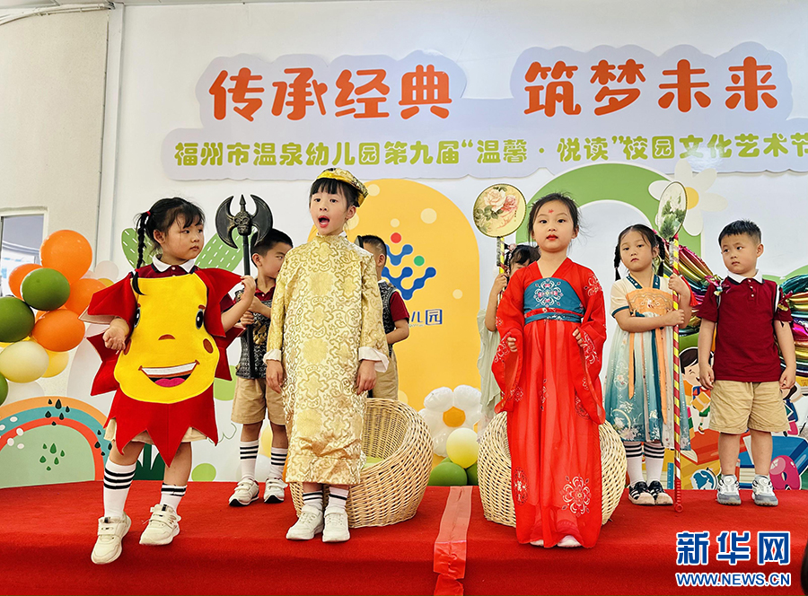 5月29日,福州市温泉幼儿园的孩子们将绘本搬上舞台,生动演绎十二生肖的故事。新华网发(张艳丽 摄)