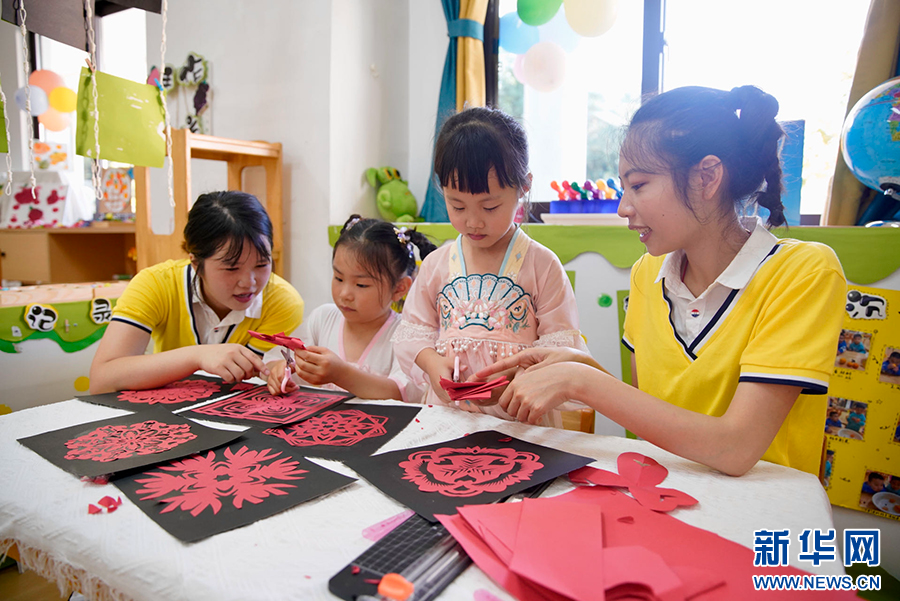 6月1日,福州高新区实验幼儿园的老师和孩子们一起体验剪纸。新华网 蒋巧玲 摄