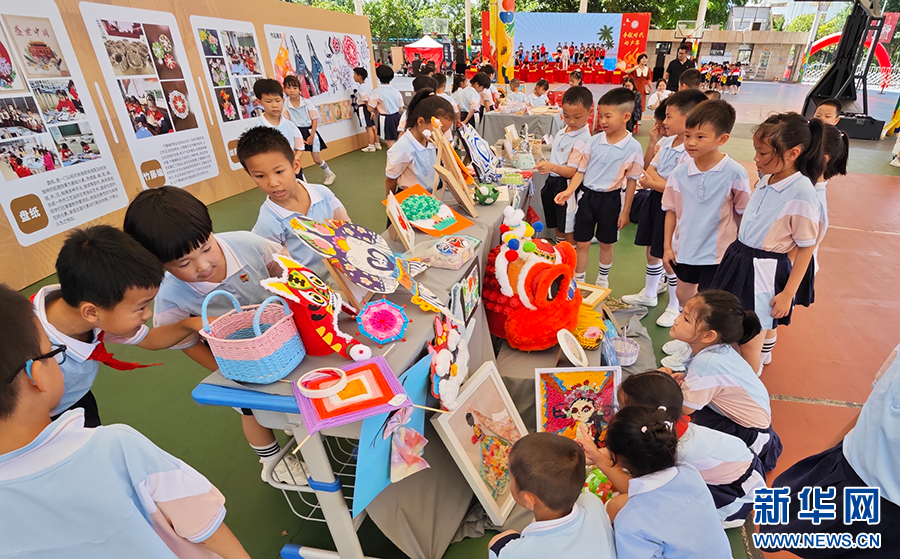 5月31日,厦门市集美区高浦小学举办非遗手作展,展出古法造纸、绕线编织、扎染等300余件学生手工作品,以此提升校园美育氛围,传承和发扬中华优秀传统文化。新华网 刘默涵 摄