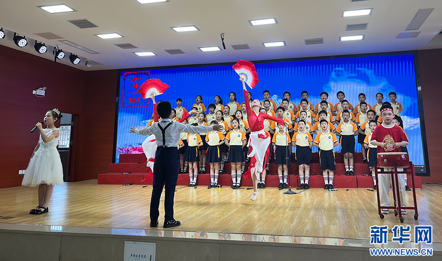 传承中华古典文化,展现古诗词的魅力。5月31日上午,福州市群众路小学举办“班班有歌声”主题活动,让孩子们把古诗文大声唱出来。图为四年一班学生表演《忆江南》。新华网发(肖阳摄)