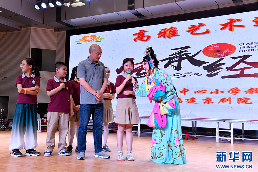 5月19日,鼓楼第二中心小学教育集团军门校区的孩子们,迎来了福建京剧院的表演艺术家们,近距离感受京剧之美。新华网发(鼓楼第二中心小学供图)