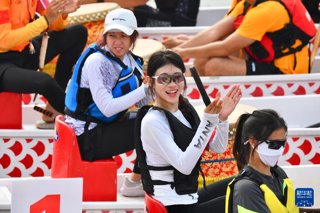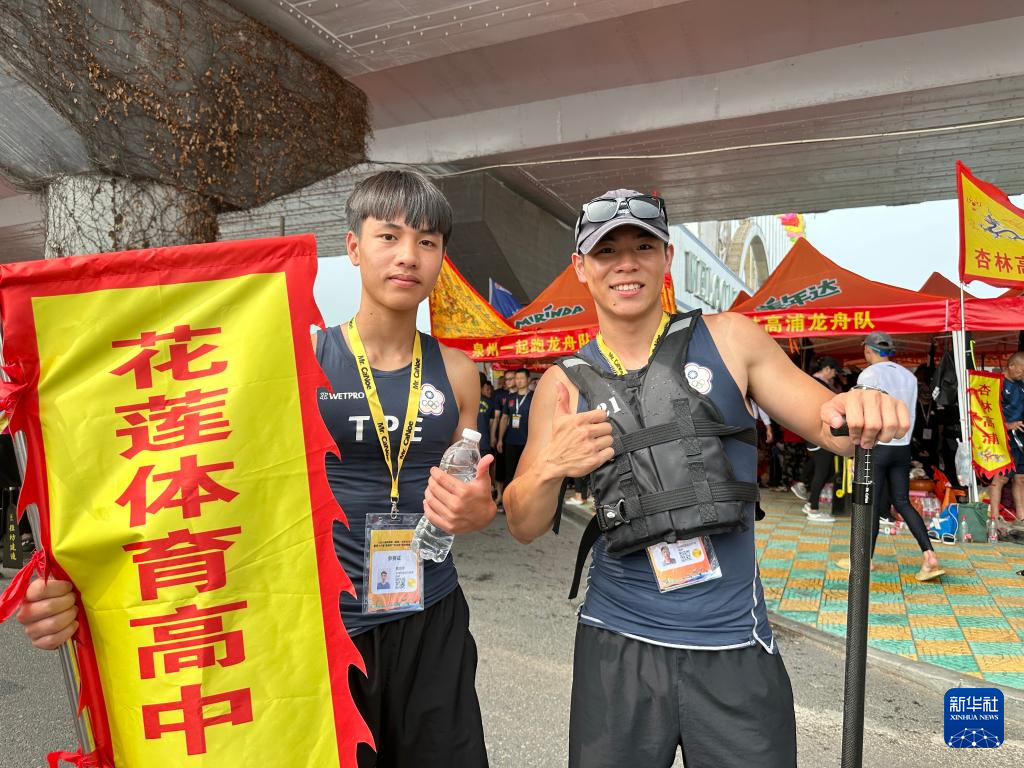6月3日,来自台湾的张宇琛(右)是第四次来参加集美龙舟赛,对比赛场地集美龙舟池“既熟悉,又亲切”。新华社记者 付敏 摄