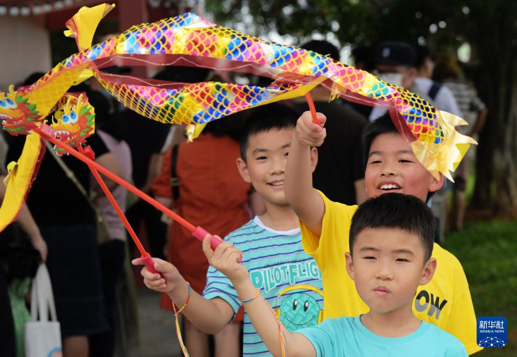 6月3日,厦门小学生在2023海峡两岸(集美)龙舟文化节活动现场体验舞龙。新华社记者 魏培全 摄