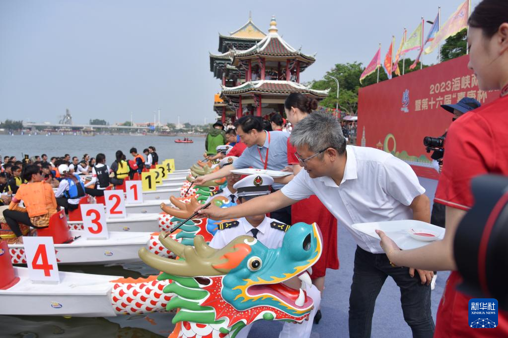 6月3日,开幕仪式上嘉宾为海峡两岸龙舟赛进行龙舟点睛仪式。新华社记者 姜克红 摄
