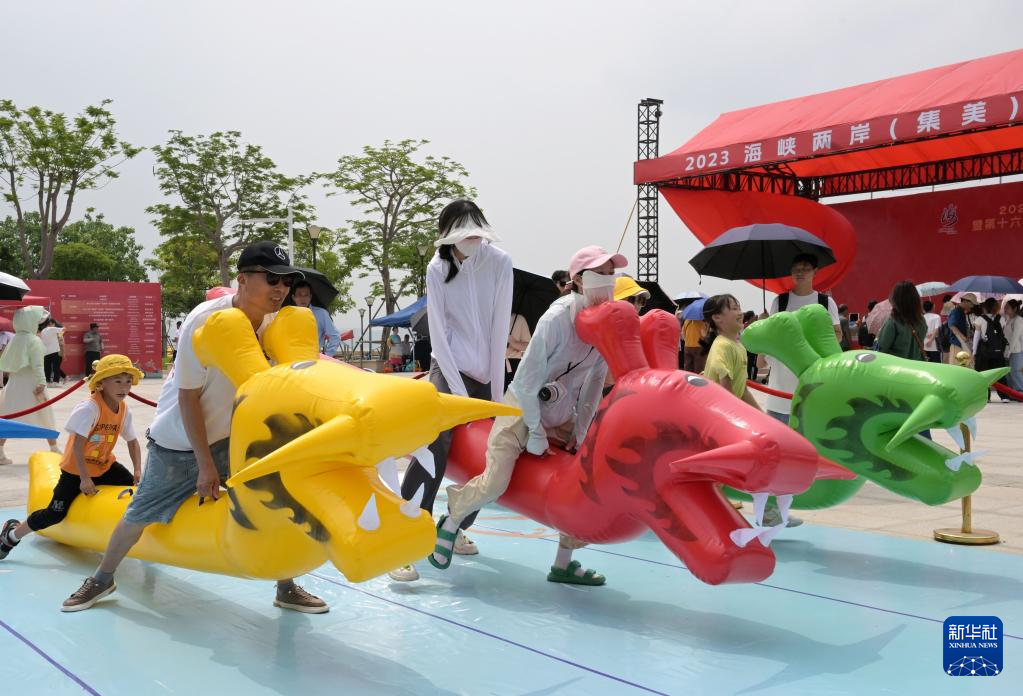 6月3日,龙舟爱好者和游客在2023海峡两岸(集美)龙舟文化节现场体验旱地龙舟比赛。新华社记者 魏培全 摄