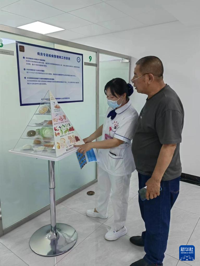 图为一名疾病管理师正在给患者讲解日常饮食注意事项。(张秀春 摄)