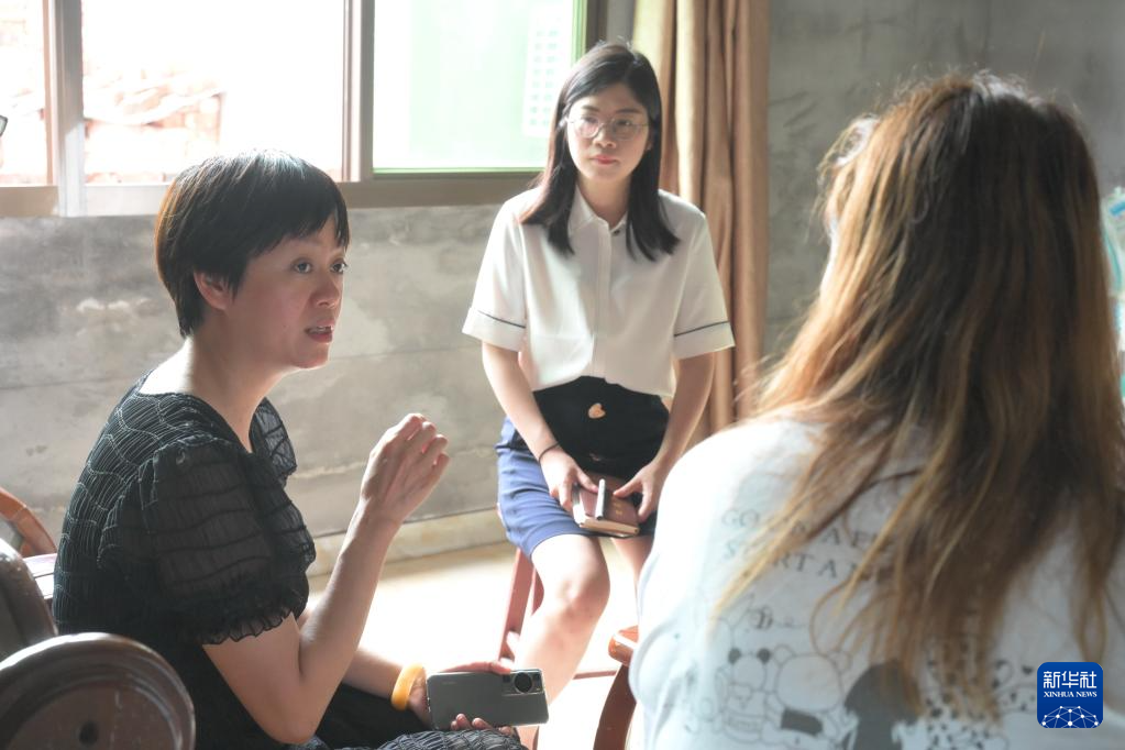 6月8日,“茉莉姐姐”服务团队成员、心理咨询志愿者陈巧铃(左一)和闽侯县青口镇妇联干部谢琳楠(左二)在一位未成年受害者家里为受害人的父母开展家庭教育指导。 新华社记者 林善传 摄