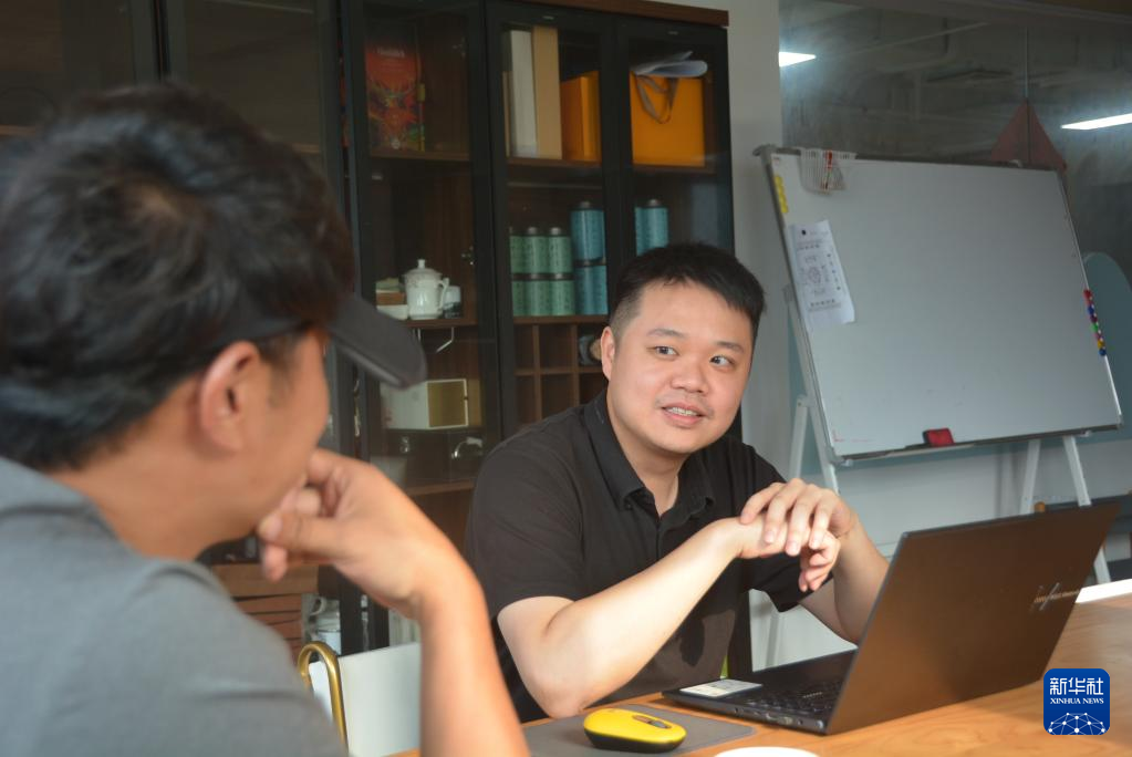 6月12日,台青张培轩与合作伙伴交流。 新华社记者 颜之宏 摄
